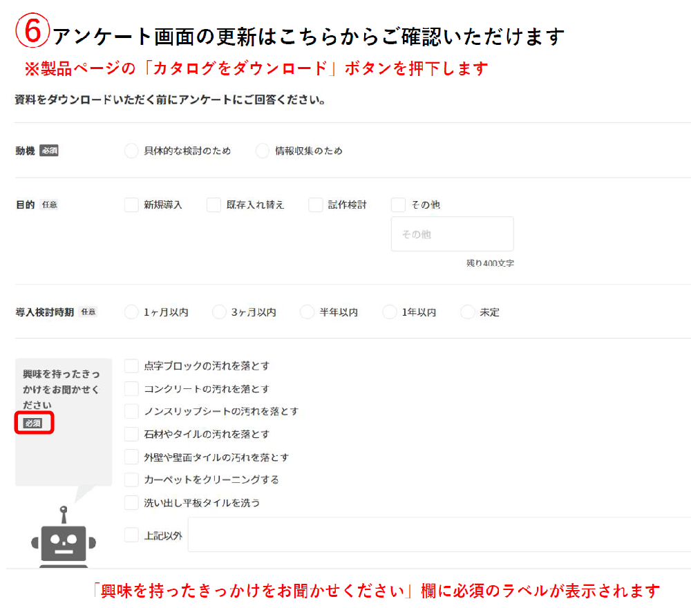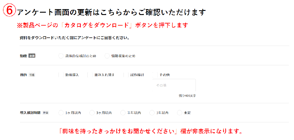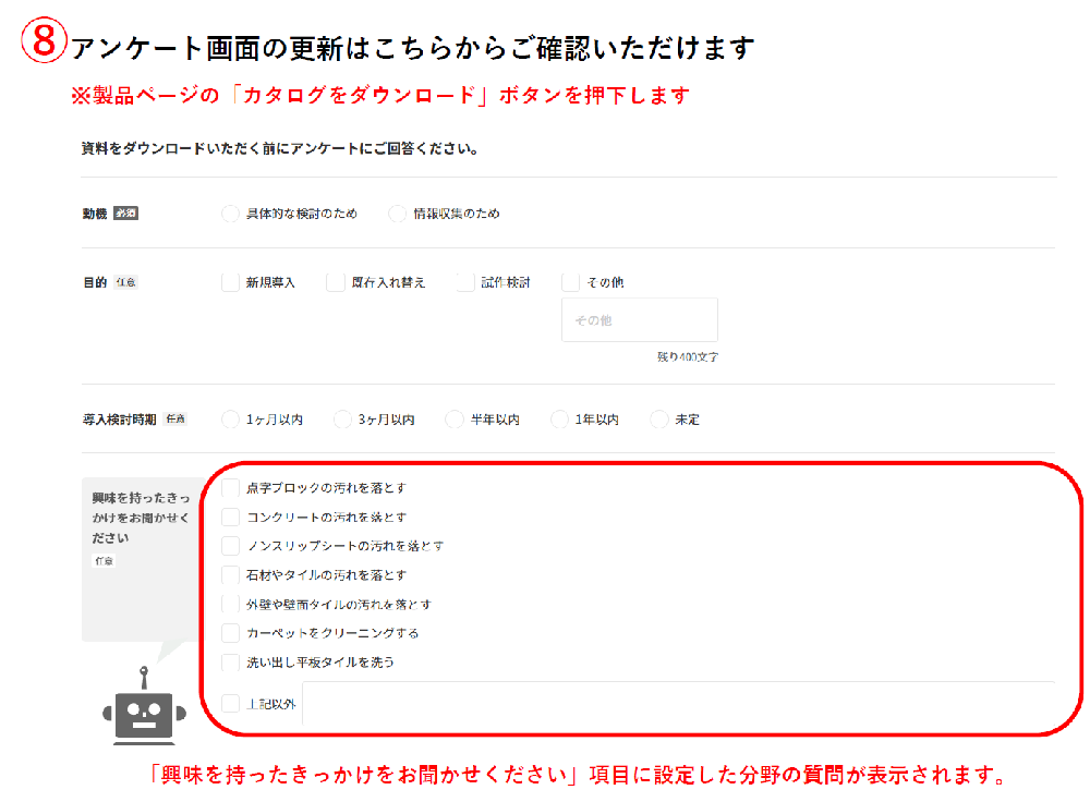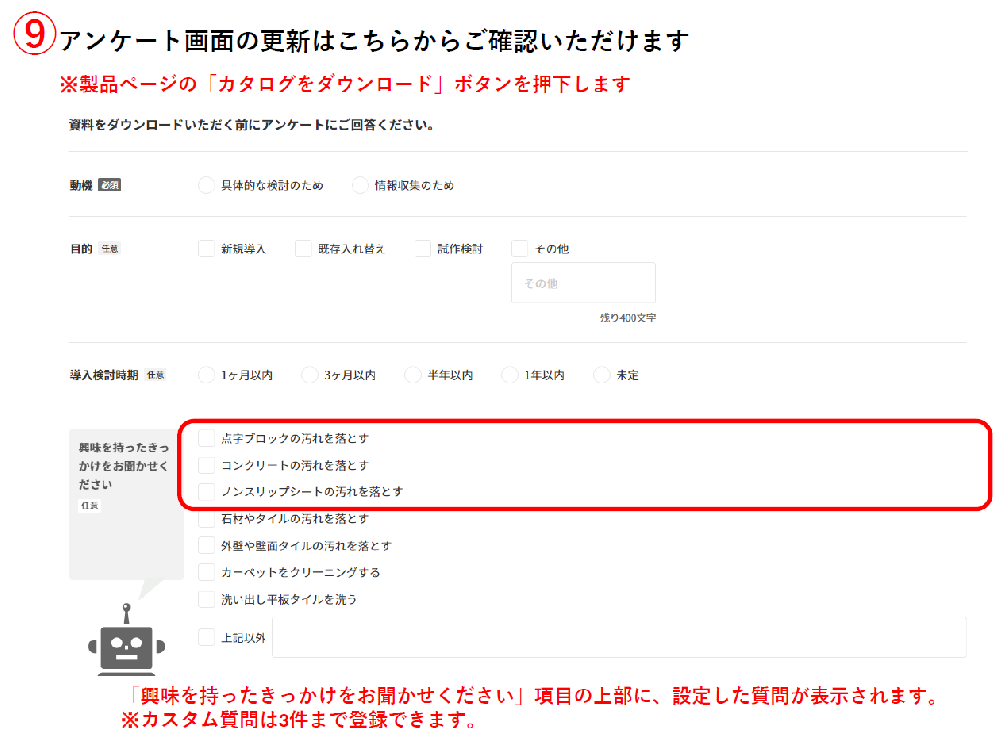 カタログダウンロードや電子ブック閲覧時に表示されるアンケートに対し、質問分野を指定したり、質問自体をカスタムすることができます。