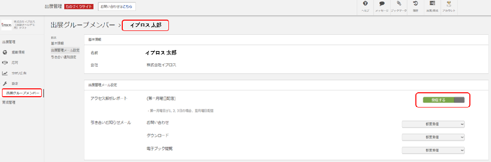 「 アクセス解析レポート 」とはなんですか? ホーム 引き合い管理・分析機能 「 アクセス解析レポート 」とはなんですか? 引き合い管理・分析機能 分析レポート 「 アクセス解析レポート 」とはなんですか? 目次 記事本文TOP 配信日 配信の設定 メルマガサンプル 自社ページの前月のアクセス状況をお知らせするメールです。 前月の自社ページの閲覧数や引き合い数をはじめ、イプロスからの耳より情報などがまとめてご覧いただけます。 配信日 第一月曜日( 第一月曜日が1、2、3日の場合、翌月曜日 ) 配信の設定 1.出展管理「 イプロスものづくり/イプロス 」を開き、《 出展グループメンバー 》をクリックします。 2.《 出展管理メール設定 》内の《 アクセス解析レポート 》の箇所から設定いただけます。 メルマガサンプル ・HTML版 ・テキスト版 < メールマガジンの受信形式について > イプロスのメールマガジンは、見やすさを向上させるため、2015年8月3日よりお使いのメールソフトの受信設定に合わせてHTMLまたはテキストで表示される「 マルチパート 」形式に移行いたしました。 その他のメールマガジンの種類についてはこちらをご確認ください。 この記事は役に立ちましたか? はい いいえ アンケートにご協⼒頂きありがとうございました ご意⾒‧ご要望※必須 サイトの改善を⽬的としたアンケートになります。 個別のご質問‧お問い合わせへの返信はできません。 個⼈情報のご⼊⼒はご遠慮くださいますようお願い申し上げます。 アンケートにご協力頂きありがとうございました。 今後の参考とさせていただきます。 一覧に戻る 関連する質問 引き合い管理・分析機能 分析レポートを確認する方法を教えてください。 引き合い管理・分析機能 「 アクセス解析レポート 」とはなんですか? 最近見た質問 イプロスについて イプロスものづくり、イプロスの違いは何ですか? 有料プラン限定機能(育成管理) 顧客情報のアップロードができません。 イプロスへの掲載サービス カタログ公開情報を削除する方法を教えてください。