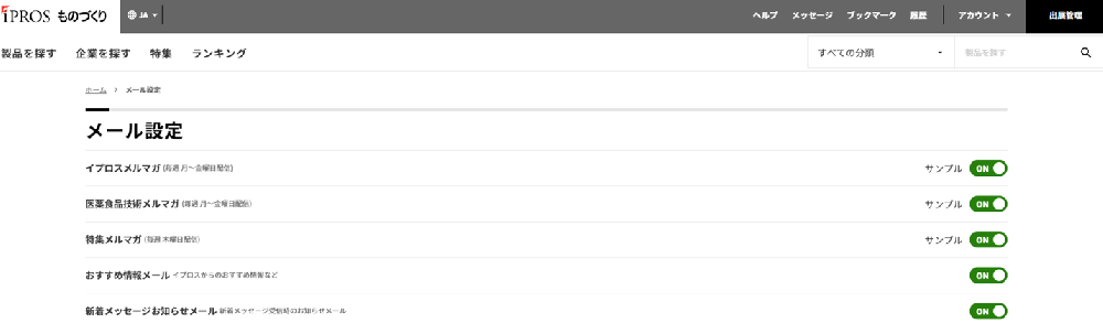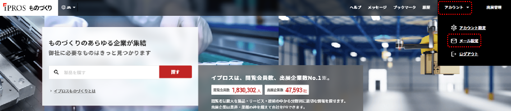1.Myイプロスへログイン後、右上の[ アカウント ]アイコンをクリックし、メール設定「 イプロスものづくり/イプロス 」を開きます。