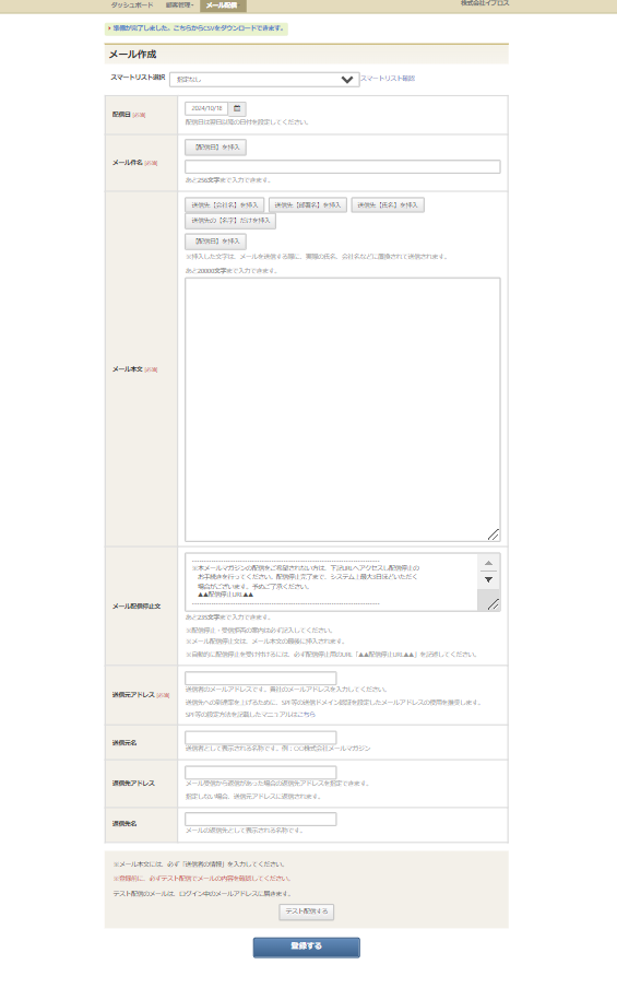 4.配信日、メール件名、メール本文、送信元アドレスなどの必須項目の入力を行います。