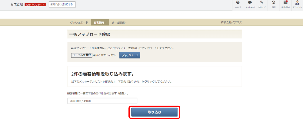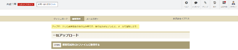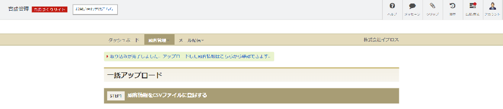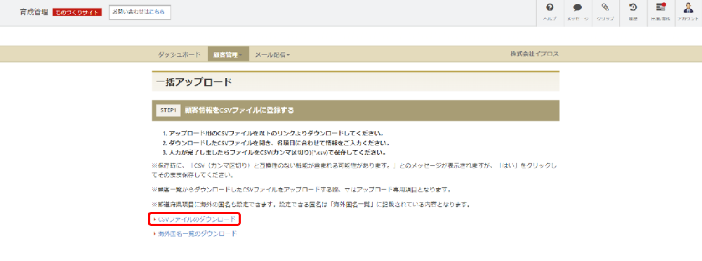 2.《 顧客管理 》 の「 一括アップロード 」 をクリックします。