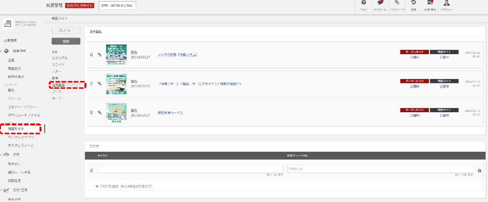 特設サイトのホーム画面に表示される注目製品は3点まで設定いただけます。