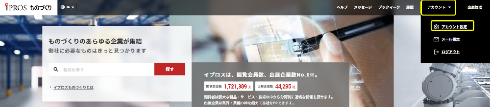 Myイプロスへログイン後、右上の《 アカウント 》から「アカウント設定」をクリックすると、ログインしているアカウントの会員情報が確認いただけます。